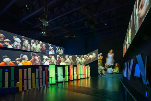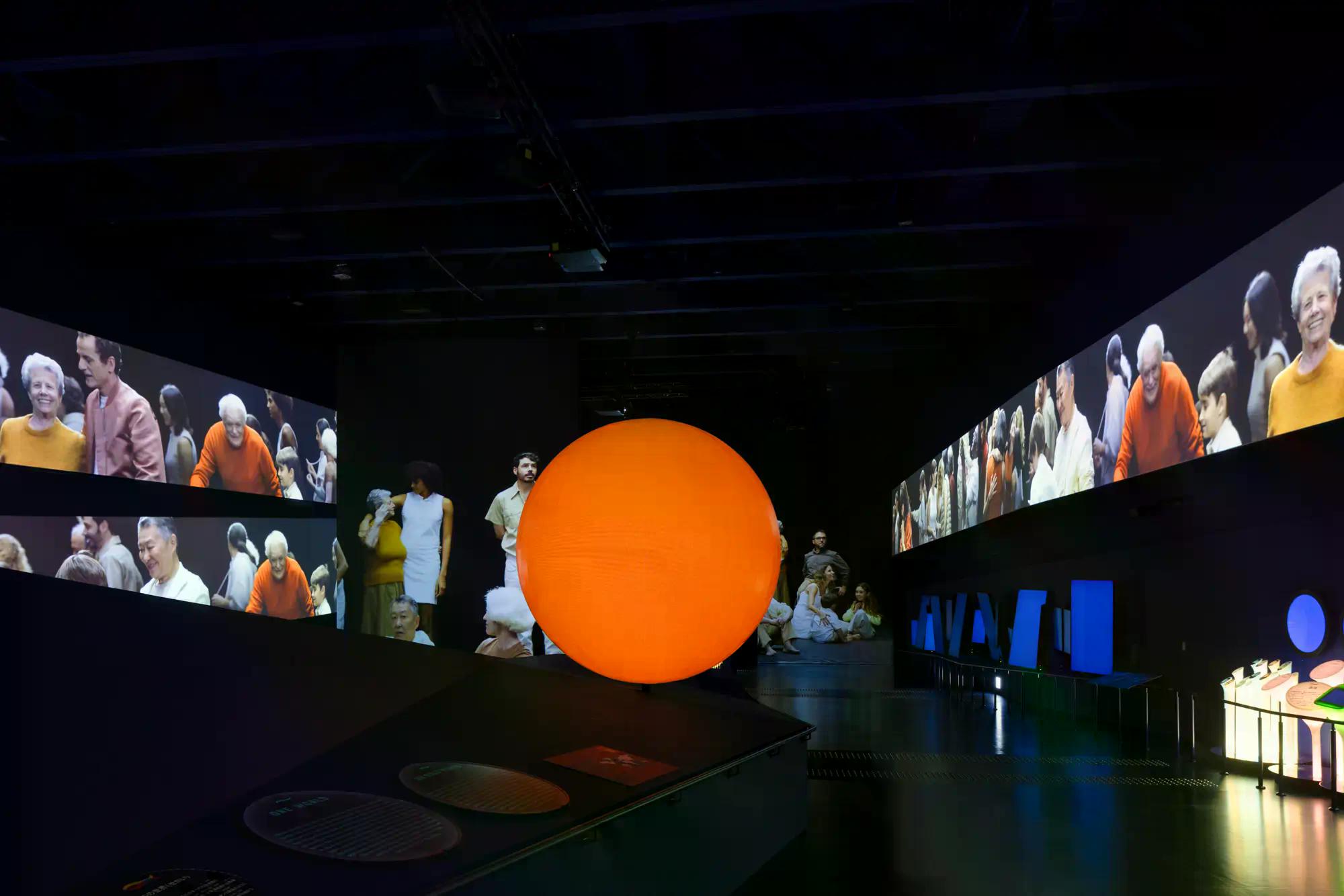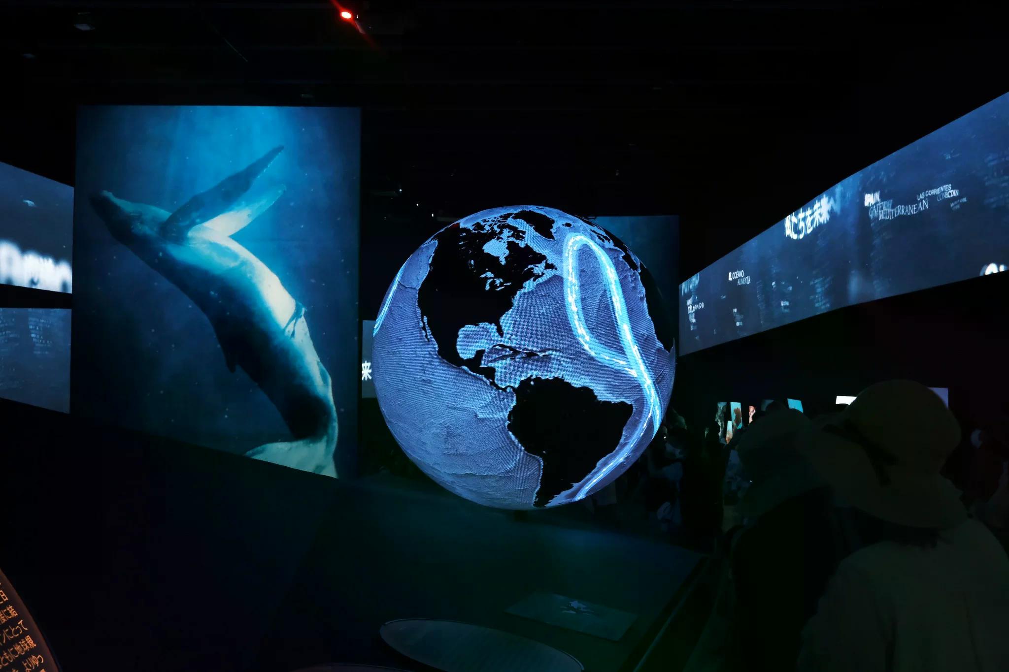 A continuous audiovisual ribbon of words, languages, and swirling water links three vast central projections, where ocean creatures and human currents intertwine, revealing how ocean flows connect cultures, innovation, and commerce.